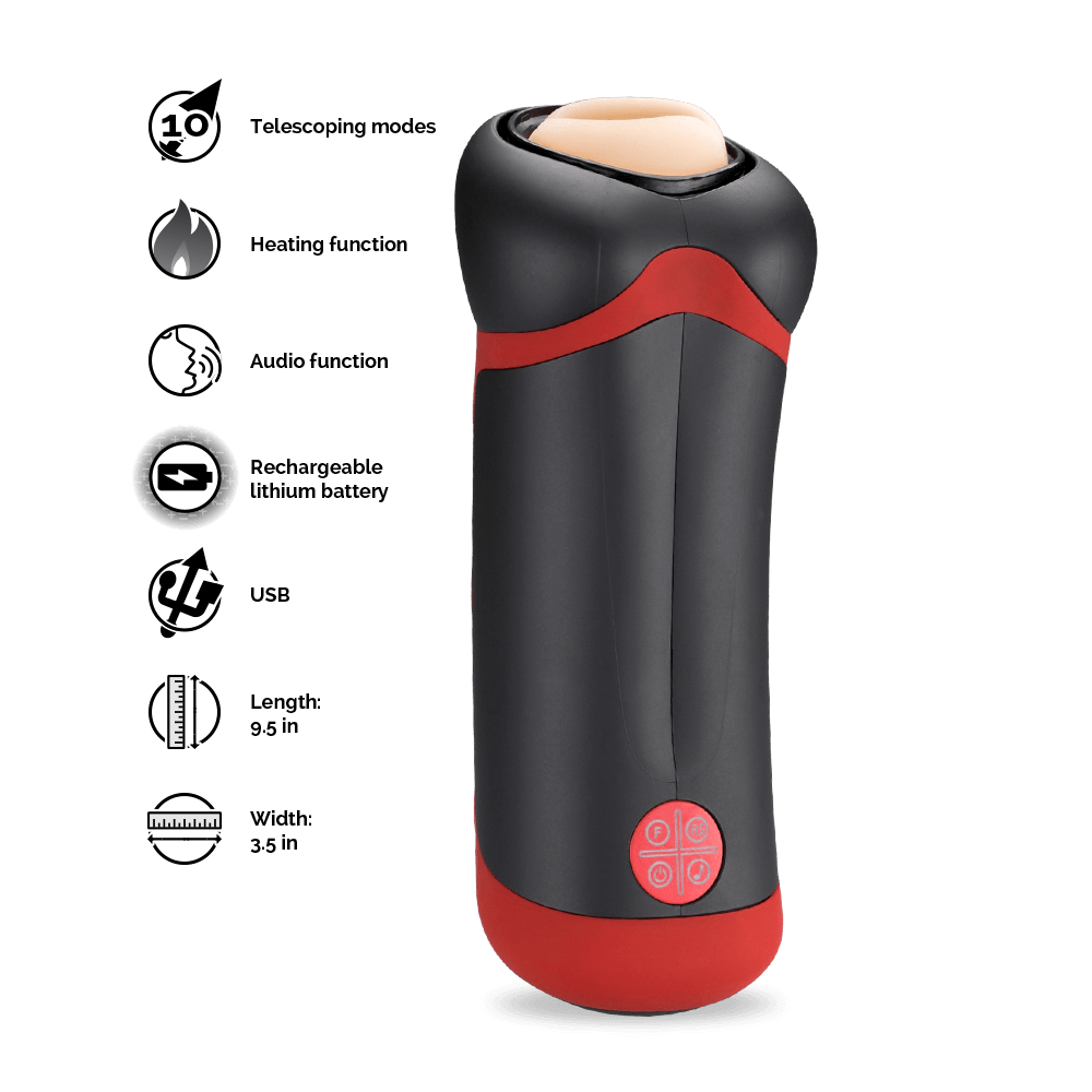As a masturbator hobbyist, it has been a long time since you saw a toy that surprised you at first glance, right? The mouth-shaped orifice and the black-red contrast all imply passionate and lewd intercourse. Just insert the erect penis deep into the sleeve, and the 6 dense rows of spikes immediately give you the first pleasure. Press the telescoping and heating start buttons, the toy is immediately activated and dedicated to serving your bro. Imagine that your hot partner hugs you with arms, her erotic lips slowly open to hold the dick with her head swinging back and forth frantically. That is so wonderful! The surprise doesn't stop there. You can freely switch between three moaning modes in English, Chinese and Japanese. Whether you are proficient in these three languages or not, it will not affect your feeling of absolute ecstasy. In addition, the overall masturbation cup is not waterproof, which means it cannot be sunk into water directly. you are allowed to wipe it with a wet towel. The inner sleeve can be removed and cleaned directly with soap and water. In this way, there can be no breeding of bacteria, thus ensuring peace of mind and worry-free use.