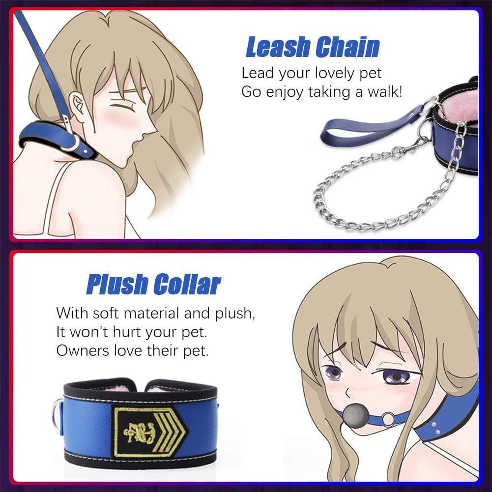 This bondage kit has 11 PCs included: 1 pair of ankle cuffs, 1 eye blindfold,1 whip, 1 leash chain, 1 collar, 1 pair of nipple clip, 1 mouth yoke, 1 cross strap, 1 bondage rope, 1 tickle feather. Each one is made of high-quality material, which is 100% body-safe.