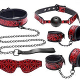 Each piece in this bondage kit is made of man made pieces, embossed with red and black diamond patterns, with matching black metal detailing. The cuffs, collar, and ball gag are fully adjustable, and the blindfold has an elastic strap to ensure a perfect fit.