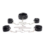 Emphasize your ownership of your slave or sub with this attractive set of shackles. Durable chains and swiveling clasps connect the collar and each cuff to restrict your lover's mobility while you play with their body or they serve you. Each comfortably padded restraint features a locking buckle to further your plaything's plight. Attach other BDSM accessories to any of the 5 D-rings that adorn each manacle and the 2 O-rings that connect the chains.